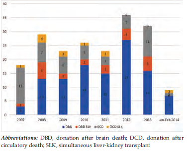 We conducted a retrospective review of all LTs performed at Aurora St. Luke’s Medical Center (Milwaukee, WI, USA) from July 2007 through February 2014. Outcomes of SLK recipients of DCD allografts were compared with DBD recipients during the same study period. All donor and recipient variables were carefully reviewed and recorded.
