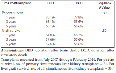Conclusions: Grafts from donors after circulatory death could help safely expand the donor pool in patients undergoing simultaneous liver-kidney transplant without compromising outcomes.