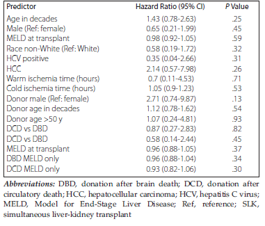 With only 13 total events, there were too few events to develop a multivariable model predicting graft or patient survival. In univariate analysis, although we noted no statistically significant predictors of outcomes after SLK, we noted a trend toward statistical significance for patient survival with age at transplant (hazard ratio [HR] 1.98; 95% CI, 0.94-4.14; P = .07) and donor male sex (HR 4.46; 95% CI, 0.96-20.76; P = .06). We noted that DCD recipient status was not significantly associated with patient death (HR 1.09; 95% CI, 0.32-3.74; P = 0.89) or graft loss (HR 0.87; 95% CI, 0.27-2.83; P = .82). When we investigated the potential interaction between MELD at transplant and type of transplant, we also noted no association with MELD in predicting DBD graft loss (MELD HR 0.96; 95% CI, 0.88-1.04, P = .34) versus DCD graft loss (MELD HR 0.93; 95% CI, 0.82-1.06; P = .30) or DBD recipient death (MELD HR 0.97; 95% CI, 0.89-1.07; P = .57) versus DCD recipient death (MELD HR 0.96; 95% CI, 0.84-1.10; P = .59). All other univariate associations are shown in (Table 3) and (Table 4).