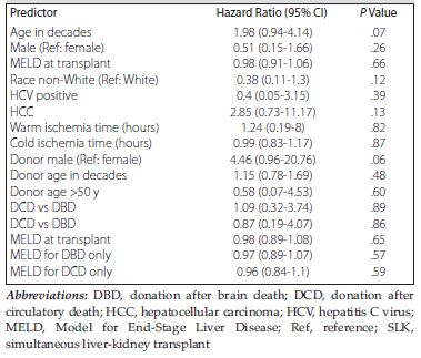Materials and Methods: This retrospective analysis included all liver transplants performed over a 7-year period at a single center. We compared categorical variables using the chi-square test and continuous variables using the t test. We compared survival using the Kaplan-Meier method and performed a univariate analysis of predictors of outcomes using Cox regression method.