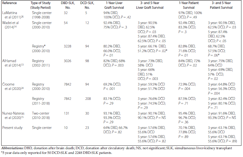 Although several studies have evaluated outcomes of single liver or kidney DCD organ transplant, data on outcomes following DCD-SLK are limited and have mostly stemmed from registry analyses. To date, there have only been 2 single-center reports, 1 two-center report, and 2 registry analyses based on data from the Scientific Registry of Transplant Recipients (SRTR) that have published outcomes specific to DCD-SLK (Table 5).
