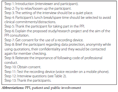 We selected semi-structured interviews with open-ended questions, as these represent the most effective way to explore the views of the participants.24 We conducted interviews in accordance with the NIHR instructions, from the PPI in Health and Social Care Research Handbook for Researchers.25 The interview guide comprised key steps such as an introduction, a brief description of the proposed feasibility study, an explanation of the purpose of the PPI consultation, consent, and interview questions (Table 1). The interview questions were aided by probe questions to facilitate further elaboration (Table 2). The results of this PPI were reported in accordance with the Consolidated Criteria for Reporting Qualitative Research (ie, COREQ) checklist, following the recommended reporting guidelines for qualitative studies and PPI consultations.26