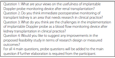 in kidney transplant surgery. This patient-public involvement consultation explored the views and expectations of the stakeholders (kidney transplant recipients, surgeons, clinicians, and nurses with direct experience of the implantable Doppler probe) on the protocol development of our feasibility study. Our objective was to improve the protocol, understand stakeholder perceptions regarding research in postoperative graft surveillance, and identify potential confounding factors to the research and challenges to implementation of implantable Doppler probe in clinical practice.