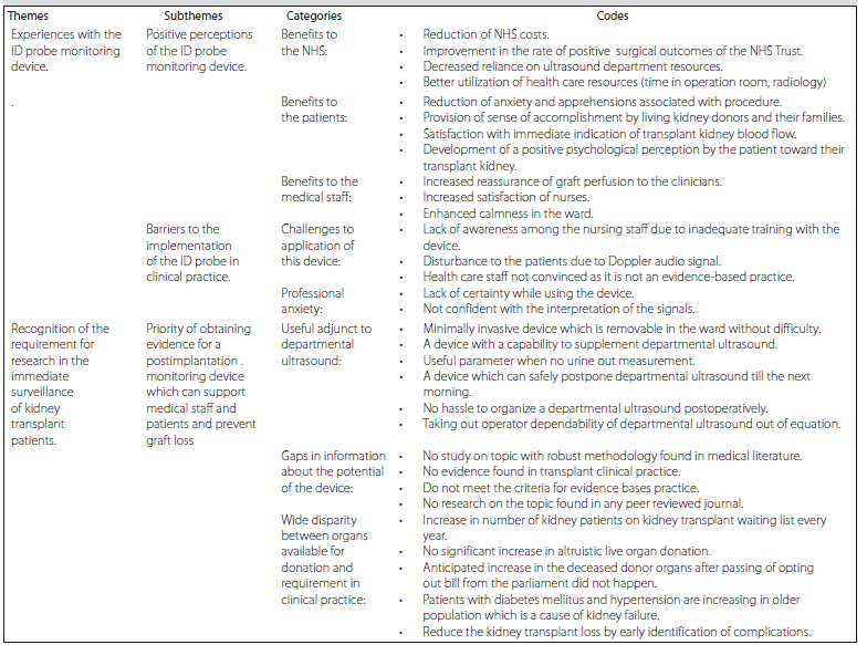 This theme was derived from 2 subthemes. The first subtheme was positive perceptions of the monitoring device, which included categories such as benefits to the NHS, health care professionals, and kidney transplant patients. The participants felt that the use of the device would have a positive effect on the NHS Trust. The health resources saved by the reduction of complications could be diverted to more severe cases. “We would be able to save money, which the Trust is trying to do by cutting expenses in all fields. All little pockets of saved money would add up.” (Nurse 1) “The overall patient outcome and graft survival of our Trust would improve.” (Clinician 2) “If the Ultrasound registrar is not caught up in the transplant ward than he would be utilizing his time on some other emergency.” (Clinician 3) The participants felt that the device may have the potential to improve patient and graft outcome, by the early identification of vascular complications. It also decreased the surgery-related anxiety of patients. “I heard the sound of my new kidney, and it was the most amazing moment of my life. I developed a psychological relationship with it.” (Patient 3) “I was very anxious before the surgery. It made me feel whatever I had gone through was worth it.” (Patient 2) “The sound was a sense of accomplishment for me and my best friend who had donated her kidney [to me]. We both hugged and cried together. We made our families listen and they were thrilled. It was a very sentimental time for all of us. I will never forget that moment, that gratitude and tears.” (Patient 1)