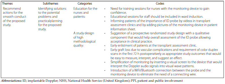 Reflexivity is fundamental to the credibility of qualitative research.36 The interviewer was a transplant surgeon with an interest in the early postoperative monitoring of kidney transplant patients. A previous working relationship existed between the researcher and the participants, who were informed of the purpose of the PPI consultation. To ensure trans-parency with the responses and improve the validity of the results, a reflexive diary was kept for bracketing out any bias from the author’s perspective.29