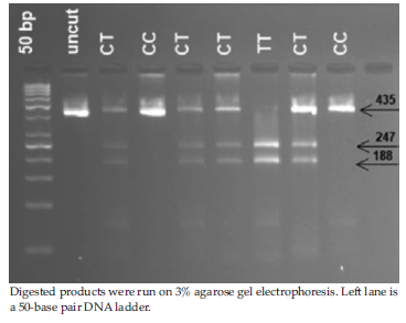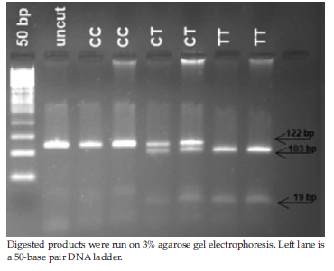 Figure 1. Polymerase Chain Reaction and Restriction Fragment-Length Polymorphism Analysis of MMP2 c.-1306C>T (rs243865) Polymorphism