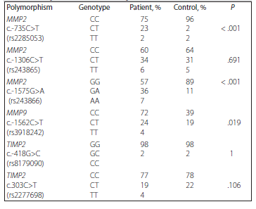 Materials and Methods: Our study included 68 kidney transplant recipients and 58 control patients. The kidney transplant recipient group was further divided into 2 subgroups: no graft rejection (n = 47) and graft rejection (n = 21). MMP2 -735C>T (rs2285053), MMP2 -1306C>T (rs243865), MMP2 -1575G>A (rs243866), MMP9 c.-1562C>T (rs3918242), TIMP2 -418G>C (rs8179090), and TIMP2 303C>T (rs2277698) polymorphisms were analyzed with the use of polymerase chain reaction and restriction fragment-length polymorphism methods. Allele prevalence was compared with reference values of the control group, and Hardy-Weinberg equilibrium was tested.