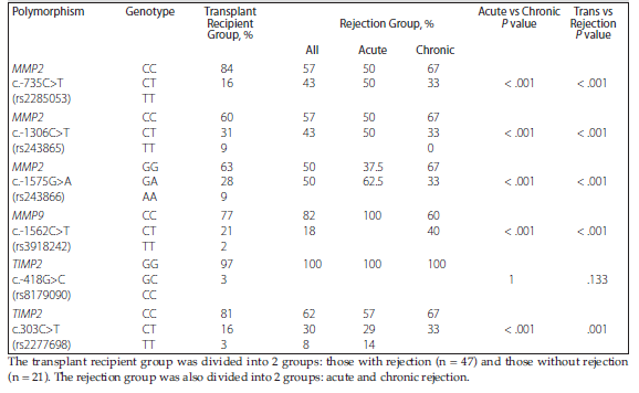 Results: Mean ages were 16.7 ± 3.9 years for the study group and 14.8 ± 5.6 years for the control group. The mean follow-up time after transplant was 37.7 ± 7.9 months. We compared allele frequencies in the 2 groups and calculated a statistically significant difference in rs2285053, rs243865, rs243866, rs3918242, rs8179090, and rs2277698 polymorphism frequencies between the transplant recipients and control patients. When the transplant recipient group was compared in itself with regard to allograft rejection, all investigated polymorphisms except TIMP2 -418G>C (rs8179090) revealed a statistically significant difference between those with and without rejection (P < .05).