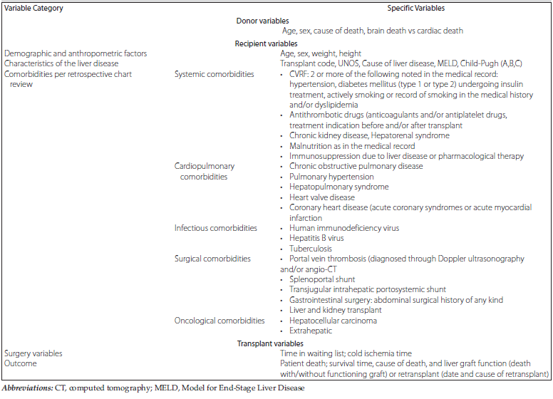 Three large groups of variables were collected (Table 1).16 Donor data included age, sex, cause of death, and donation after cardiac death or after brain death. Recipient data included demographic and anthropometric characteristics of the recipient. Characteristics of liver disease included list entry code, etiology of liver disease, Model for End-Stage Liver Disease (MELD) score, Child-Pugh score, and recipient comorbidities. Transplant data included surgery variables (time on wait list, cold ischemia time). Evolution variables included patient death. Survival time and cause of death were collected according to the Spanish Liver Transplant Registry (RETH) categorization and the graft function in case of death (death with/without functioning graft, retransplant).