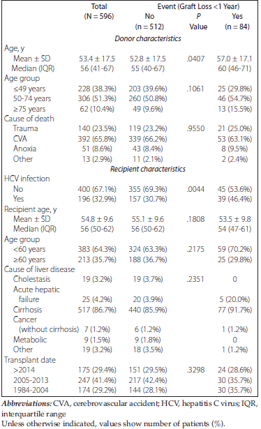 The event under study was loss of the graft in the first year, either by retransplant or death due to any cause with graft dysfunction.