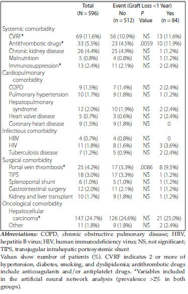 (Table 4) shows a description of the 2 event groups in relation to all the comorbidities analyzed. Of all the comorbidities studied, only the use of antiplatelet and/or anticoagulant agents (4.5% vs 11.9%; P < .01) and portal thrombosis (30.7% vs 46.4%; P < .01) showed significant relation with the occurrence of the event.