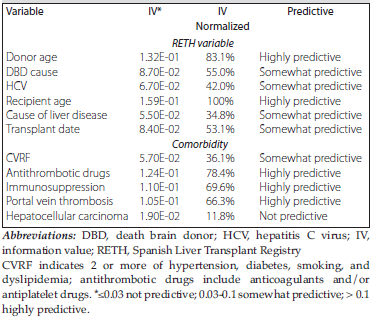 Results: Most patients in our study were men (75.5%); mean age was 54.8 ± 9.6 years. The main cause of transplant was cirrhosis (86.7%), and 67.4% of patients had some associated comorbidities. Graft loss due to retransplant or death with dysfunction occurred in 14% of cases. Of all the variables analyzed, we found 3 comorbidities associated with graft loss (as shown by informative value and normalized informative value, respectively): antiplatelet and/or anticoagulants treatments (0.124 and 78.4%), previous immunosup-pression (0.110 and 69.6%), and portal thrombosis (0.105 and 66.3%). Remarkably, our model showed a C statistic of 0.745 (95% CI, 0.692-0.798; asymptotic