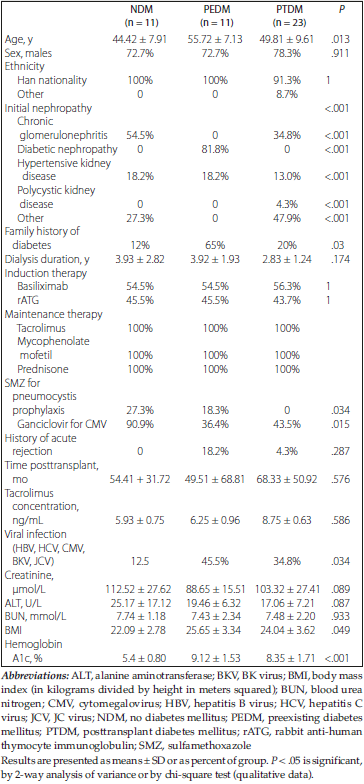 The study included 45 KT recipients, including 23 recipients in the PTDM group, 11 in the NDM group, and 11 in the PEDM group. The demographic and clinical characteristics of patients are shown in Table 1. The initial immune maintenance scheme of the 3 groups of recipients was a triple scheme (tacrolimus + mycophenolate mofetil + prednisone), and no differences in sex, diabetes family history, immune induction scheme, time after transplant, dialysis time, tacrolimus concentration, creatinine level, alanine aminotransferase level, and blood urea nitrogen were observed. Compared with the NDM group, the PTDM group recipients were older, were administered less sulfamethoxazole, had a higher incidence of adverse reactions and virus infections, high body mass index, and high hemoglobin A1c level.