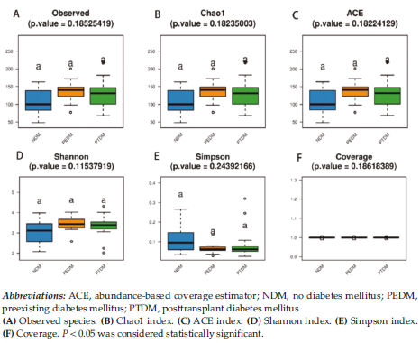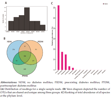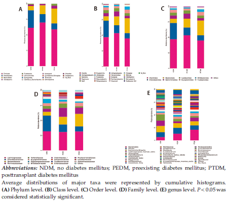 To explore the characteristics of GM in PTDM recipients and evaluate the correlation between PTDM and GM, we collected fresh fecal samples of recipients without diabetes mellitus (NDM group), recipients with preexisting diabetes mellitus (PEDM group), and recipients with PTDM (PTDM group) for 16S rRNA gene sequencing.