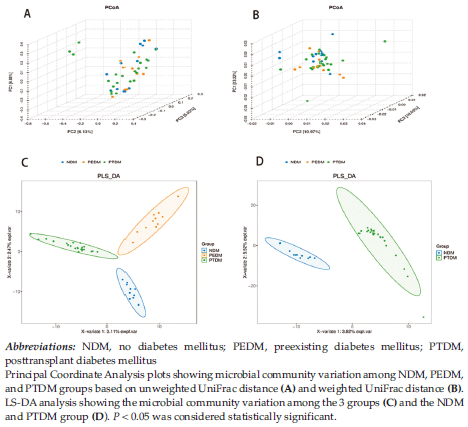 We used PCoA analysis based on UniFrac distance to visualize the similarity of GM among the NDM, PEDM, and PTDM groups using a 3-dimensional map. Notably, different bacterial characteristics were observed on the unweighted and weighted UniFrac PCoA maps (Figure 3, A and B). Furthermore, partial least squares discriminant analysis revealed significant differences among the 3 groups (Figure 3, C and D). With the permutation multivariate ANOVA evaluation data, we observed statistically significant differences in unweighted and weighted UniFrac distances among the PTDM, NDM, and PEDM groups (P = .046, P = .035). These findings indicate that the GM of KT recipients with PTDM was significantly different from that of NDM and PEDM recipients.