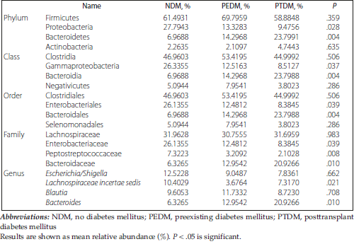 Materials and Methods: Feces samples from recipients with diabetes 3 months after kidney transplant were collected and analyzed using high-throughput 16S rRNA gene sequencing.