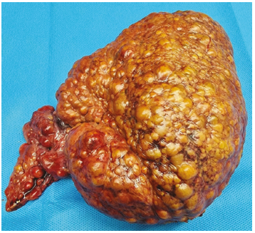 The patient received a DDLT from a 25-year-old male donor with brain death caused by head trauma. The anesthetic plan included total intravenous anesthesia with propofol, fentanyl, and the nondepolarizing muscle relaxant cisatracurium for both induction and maintenance of general anesthesia. Special care was taken to ensure normocapnic ventilation and maintain normothermia during anesthesia for this patient with ichthyosis, including the use of a heating pad on the bed. Precautions were also established for positioning, transportation, and mobilization. The LT was performed according to the piggyback technique. The recipient’s liver after hepatectomy on the day of LT is shown in Figure 1, and the liver biopsy showed severe microvesicular and macrovesicular steatosis.