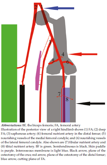 Osteotomy of the thigh. The lateral crus incision was extended along the anterolateral edge of the hindlimb toward the hip to expose the anterior edge of BF. The BF was pulled back to expose the lateral femoral condyle and V3. After the V3 was cut, we carefully noted the origination of the V3, which was crucial for determination of the plane of the osteotomy of the distal femur. Thereafter, the BF was pulled back to expose V1. After the V1 was cut, the BF was pulled further back. At this stage, nearly the whole posterolateral edge of the femur could be touched directly. Periosteal dissection of the femoral shaft was performed, and we proceeded with the osteotomy of the femur at 2 to 3 cm proximal to the origination of V3 under direct vision (Figure 1).