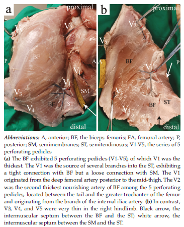 The biceps femoris (BF) is a broad muscle that covers most of the lateral side of the thigh, knee, and proximal crus. Generally, most BF muscles have a very loose connection to muscles other than the semitendinosus, which facilitates ease of blunt separation. The BF exhibited 5 perforating pedicles (V1-V5), of which V1 was the thickest. The V1 pedicle also was the source of several branches into the semitendinosus, which exhibited a tight connection with BF but a loose connection with the semimembranosus. The V1 pedicle originated from the deep FA posterior to the mid-thigh (Figure 2). The V3 pedicle was very thin and originated directly from the FA and shared a common trunk with the nourishing artery of lateral femoral condyle. Retrograde anatomy revealed that the external iliac artery divided into the deep FA and the FA in the abdominal cavity, approximately 2 cm above the inguinal ligament (Figure 1).