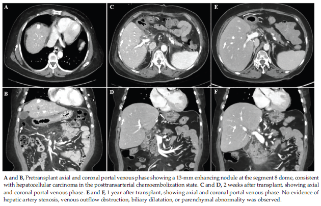 The recipient was a 66-year-old woman with hepa-titis B-related cirrhosis and hepatocellular carcinoma (mUICC stage I). Preoperative computed tomog-raphy (CT) demonstrated a cirrhotic liver with a 13-mm LR-5 hepatocellular carcinoma lesion at the dome of segment 8, previously treated with transarterial chemoembolization (Figure 1, A and B). The donor was her 42-year-old daughter. Donor volumetry indicated a whole liver weight of 1185 g, with right and left lobes measuring 770 g and 415 g, respectively, leaving a remnant of 35%. The estimated graft-to-recipient weight ratio was 1.13.