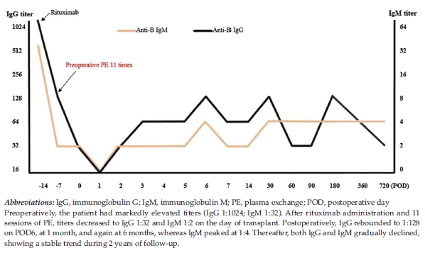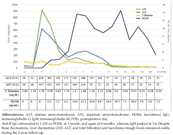 ABO-incompatible living donor liver transplantation (ABO-iLDLT) has become a practical approach to expand the donor pool in regions with organ shortages. Advances in desensitization and immuno-suppression have improved outcomes; however, antibody-mediated rejection (AMR) remains a key immunologic challenge, and its definition and mana-gement continue to evolve.1,2 The incorporation of rituximab has significantly enhanced survival in recipients with chronic liver disease and acute liver failure. Nevertheless, perioperative strategies differ across centers, including decisions regarding splenectomy, biopsy indications, and rescue therapy thresholds. No universally accepted guideline has yet been established.3-6 The clinical effects of post-transplant isoagglutinin rebound remain debated. Some investigators associate rebound with AMR and graft dysfunction, whereas others report stable function despite high titers.7,8 These divergent findings raise the question of whether antibody titers alone should drive intervention. Here, we describe an ABO-iLDLT case (B→O) performed despite extremely high preoperative titers. Although posto-perative rebound occurred, the patient maintained stable graft function without AMR for 2 years. This case supports the importance of evaluating antibody levels in conjunction with biochemical and clinical data and provides evidence for splenectomy-free protocols under structured desensitization.3,5