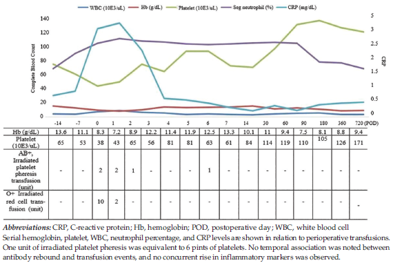 At 2 years, titers had stabilized at IgG 1:32 and IgM 1:2 (Figure 3). Liver function tests and tacrolimus trough levels remained within target ranges (Figure 4). Hematologic indices and C-reactive protein, assessed alongside perioperative transfusions, showed no significant abnormalities (Figure 5). Because laboratory parameters were stable and CT scans revealed no biliary dilatation or vascular abnormalities, neither liver biopsy nor magnetic resonance cholangiopancreatography was performed. No AMR, graft dysfunction, or infectious complica-tions occurred during the 2-year posttransplant obser-vation period.