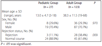 Table 2. Relationship of Rejection With Age and Sex in Pediatric and Adult Transplant Recipients and Control Group