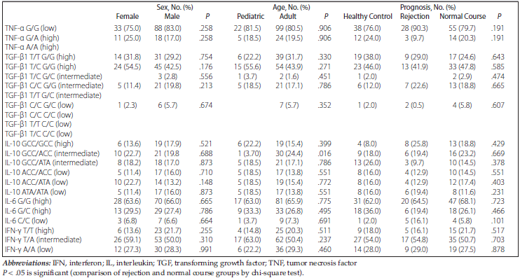 Table 4. Cytokine Polymorphism by Prognosis, Age Group, and Sex in Transplant Recipients
