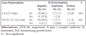 Table 5. Relationship of Statistically Significant Cytokine Gene Polymorphisms With Angiotensin II Type 1 Receptor Antibody Level