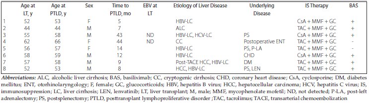 Table 1. Baseline Characteristics of Liver Transplant Recipients with Posttransplant Lymphoproliferative Disorder (N = 8)