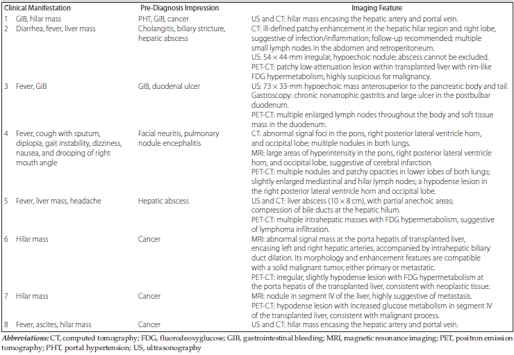 Table 2. Clinical Manifestations and Imaging Features of Liver Transplant Recipients With Posttransplant Lymphoproliferative Disorder (N = 8)