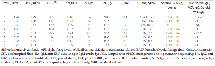 Laboratory findings were nonspecific but could serve as the initial alarm. Among 8 transplant recipients with PTLD, 4 showed an abnormal increase in blood concentration of immunosuppressant, 6 showed liver dysfunction, and 7 showed increased EBV DNA load (in case 4, cytomegalovirus DNA was 2.15E+004 copies in cerebrospinal fluid, with 3976 and 33 copies in cerebrospinal fluid and bronchoalveolar lavage fluid by next-generation sequencing, respectively). All recipients had normal cytomegalovirus DNA, procalcitonin, creatinine and alpha-fetoprotein level (Table 3).