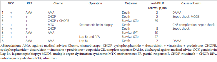 Table 5. Treatment and Prognosis of Liver Transplant Recipients With Posttransplant Lymphoproliferative Disorder (N = 8)