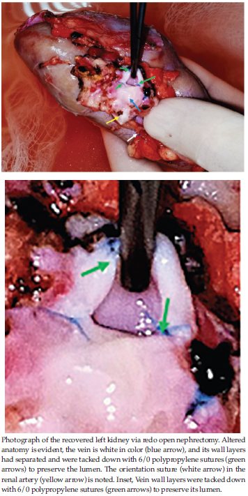 The difficulty in dissecting this redo kidney and its hilum is reflected in the long duration of time that it took (7 hours) to complete. Donor nephrectomy is technically more demanding than routine nephrec-tomy because, in this case, the artery and vein need to be preserved for implantation. When tissue planes are obscured, as in our donor, identifying and dissecting hilar vessels become extremely challenging, with the looming risk of vascular damage.3,4 The normally blue-colored vein in this case was white, indicating fibrosis of the vein wall, and redo dissection had resulted in separation of the layers of its wall, which needed to be tacked down with 6/0 polypropylene sutures to preserve the lumen. The artery and vein were both the same color and indistinguishable; therefore, bench dissection was kept to a minimum to avoid inadvertent vascular damage.
