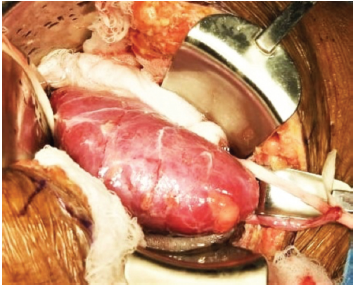 The renal vein, which is normally blue in color, was white, with separation of the layers of its wall; which had to be tacked down with 6/0 polypropylene sutures to preserve the lumen to enable anastomosis ((Figure 2), inset). The artery and vein were both essentially the same color, and minimal bench dissection was carried out to avoid any inadvertent vascular damage.