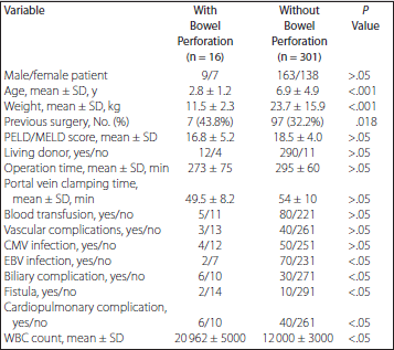 After application of inclusion and exclusion criteria, 317 patients were deemed eligible for inclusion. We categorized patients into 2 groups: with and without bowel perforation. We examined medical records of all 317 patients for various demographic, clinical, and perioperative variables. We performed statistical analyses to determine significant differences between groups with and without bowel perforation. From medical records, we collected age at transplant, sex, underlying diseases, surgical history before transplant, paraclinical data, radiologic findings, and Pediatric End-Stage Liver Disease (PELD), Model for End-Stage Liver Disease (MELD), and Child-Turcotte-Pugh scores. We collected perioperative data, including cold and warm ischemia time, surgical approach, operative time, blood transfusion, and length of hospital stay. We collected immunosup-pressant and other drugs used after transplant, postoperative follow-up, details of the perforation and clinical presentations, and methods of repair and outcomes.