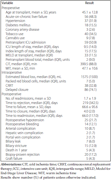 Median cold ischemia time was 400 minutes (range, 356-444 min), whereas mean warm ischemia time was 47.0 minutes. No organs in the cohort underwent machine perfusion. Thirty-eight patients (32.8%) required intraoperative continuous renal replacement therapy (CRRT). Fourteen patients (12.1%) developed postoperative bleeding requiring intervention, and 10 patients (8.7%) developed a complication involving the hepatic arterial anas-tomosis. Median length of hospital stay was 15 days (range, 6-24 days), with significant variation. Among 71.6% of patients who required readmission at some point after transplant, median time to readmission was 66 days (range, 8-125 days). Forty-nine patients (42%) were readmitted within 90 days of transplant. In the first year posttransplant, 5 patients (4.3%) died and 5 patients (4.3%) exper-ienced graft failure requiring retransplant. In addition, 20 patients (17.2%) developed biopsy-proven rejection, with median time to rejection of 219 days (range, 48-390 days).