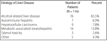 The study included 116 patients; basic characteristics are listed in Table 1. Mean age at transplant was 45 years, and average BMI was 28.3. The most common etiology of hepatic dysfunction was alcohol-associated cirrhosis (65.5%), followed by metabolic-associated steatohepatitis. Table 2 lists disease etiologies of patients. The median MELD at time of transplant was 33 (range, 27-38). Fifty-nine patients (50.9%) required ICU admission before transplant, with median preoperative ICU length of stay of 10 days (range, 3-17 days). All but 2 patients received organs from donation after brain death donors; these 2 patients received organs from donation after cardiac death donors.