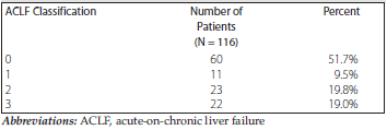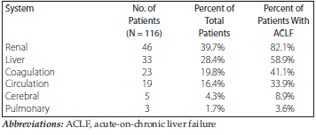 Acute-on-chronic liver failure was present in 56 of 116 patients in this cohort. Table 3 details the classification of severity of ACLF. Sixty patients (51.7%) were classified as ACLF 0. Fifty-six patients were classified into stages 1-3 based on the number of organ failures. Specifically, 22 (19.0%) had ACLF 3, 23 (19.8%) had ACLF 2, and 11 (9.5%) had ACLF 1. Table 4 lists distribution of ACLF by organ failure.