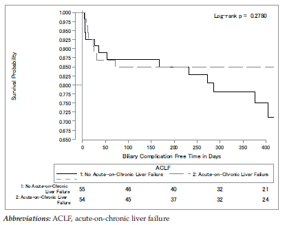 Acute-on-chronic liver failure was present at the time of LT in 48% of patients (56/116 patients) included in this study. Among the 56 patients in the ACLF group, 9 developed posttransplant biliary complications (3 patients with biliary leaks and 6 patients with biliary strictures). In comparison, 12 of 60 patients without ACLF developed posttransplant biliary complications (8 with biliary leaks, 3 with biliary strictures, and 1 who developed an early biliary leak followed by a later biliary stricture). The presence of ACLF was not a significant risk factor for the development of biliary complications. In fact, patients with ACLF experienced lower rates of biliary complications, although this did not reach statistical significance. Figure 1 displays Kaplan-Meier curves tracking time free of biliary comp-lications for patients with and without ACLF. Patients with ACLF who developed biliary compli-cations did so primarily within 100 days of transplant, whereas patients without ACLF continued to develop complications up to 400 days posttransplant.