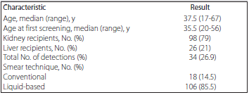 During the study period, 124 female kidney or liver transplant recipients underwent routine cervical cytology screening. Patients who had no prior sexual intercourse history were excluded. We used descriptive statistics to characterize the variables. We presented categorical variables as frequencies and proportions. We used the χ2 test was for categorical variables. P < .05 was considered statistically signi-ficant. We used SPSS version 30.0 for statistical analyses.