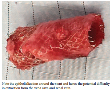 The patient sought consultation at our center, and, following a thorough and informed consent process and evaluation by gynecology and vascular surgery, she elected to undergo renal autotransplant, with removal of stents and ligation/excision of her gonadal vein and coils. The initial approach involves total mobilization of the vena cava above and below the renal vein, with ligation of the lumbar veins, and exposure of the contralateral renal vessels. A Satinsky clamp was placed below the level of the stents in a side-biting manner on the cava, and an elliptical incision was made at the junction of the renal vein and vena cava. Using a spatula to dissect the stent off the caval wall, we extracted both stents along with the kidney. The edges of the vena cava were then sewn using 4-0 Polypropylene with minimal narrowing. After excision of the stent from within the renal vein (Figure 1), we implanted the kidney into the right iliac fossa in a standard manner on the common iliac vein and artery, with a modified Lich-Gregoir ureteroneocystostomy. The left gonadal vein along with the coils was excised entirely.