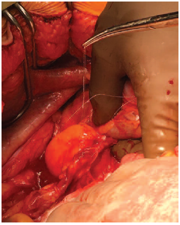 After total mobilization of the vena cava as described earlier, we proceeded in the manner of clamping the vena cava below the left renal vein, clamping the contralateral renal vein, and clamping the vena cava above the left renal vein. After ligation of the left renal artery, we excised the left vein with a cuff of the vena cava where the stent was extruding. Using sharp scissors, we carefully dissected the stent off the posterior cava wall. After the kidney was extracted, we assessed the defect in the vena cava and proceeded with performing an elliptical patch venacavaplasty using bovine pericardium (BP) (Figure 4). We elected to implant the kidney on the ipsilateral side (left) on the external iliac vein, with end-to-end arterial anastomosis to the left internal iliac artery, and a pyelovesicostomy was performed.
