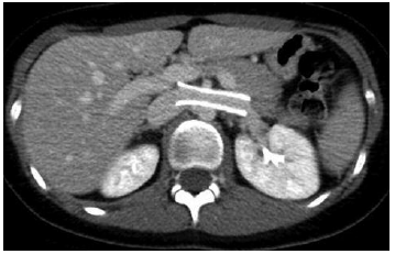 Case 3, a 16-year-old female with refractory pain and inability to cope, leading to deterioration in her school performance, was referred to us for further management. She was diagnosed with NCS based on symptoms of left flank pain, hematuria, and pelvic congestion syndrome. Her past medical history was notable for endometriosis, Hashimoto thyroiditis, depression, anxiety, and asthma. Fourteen months earlier, she had left renal vein stenting and left pelvic vein embolization. She had undergone extensive work-up, counseling, and psychiatric evaluation. A CT scan performed at our institute showed patency of the stent; however, there was clear extrusion of the stent through the anterior wall of the vena cava (Figure 3). After thorough consent, we proceeded with renal autotransplant.