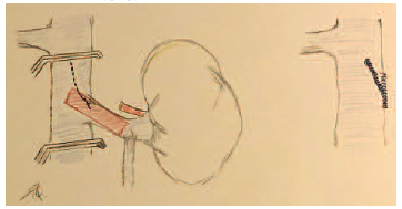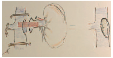 After mobilization and clamping of the vena cava above and below the renal vein, a longitudinal venotomy of the vena cava was performed, with direction toward the renal vein ostium. Using sharp scissors, we dissected the stent off the caval walls and lifted it from the inside and off the renal vein ostium. After extraction of the kidney, we closed the longitudinal venotomy in continuum with the renal vein ostium, ensuring that luminal narrowing would not be encountered (Figure 5). This patient was also found to have severe narrowing of her left common iliac vein secondary to compression by the right common iliac artery (May-Thurner syndrome). Because this patient also had leg pain and pain radiating down the thigh, we elected to repair the narrowing. We mobilized the common iliac veins bilaterally and encircled them. We then proceeded in the manner of clamping the right common iliac vein, the left common iliac vein proximal to the narrowing, and the vena cava above the bifurcation. We per-formed a longitudinal venotomy over the narrowing, and sutured in a BP patch to create a wider lumen of the left common iliac vein. The left gonadal vein was ligated and excised along with the coils. We then proceeded with autotransplant on the right common iliac vein and artery, with a modified Lich-Gregoir ureteroneocystostomy.