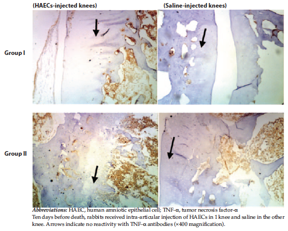 Results: Similar to results shown in noninjected and saline-injected knees, all treated knees appeared normal, with no signs of acute immuno-rejection, no microbial colonization, no pain, no allergic reactions, no inflammation, and normal motion. Use of human amniotic epithelial cells appeared safe without risk of immuno-rejection or tumor formation in the transplanted knee joint.