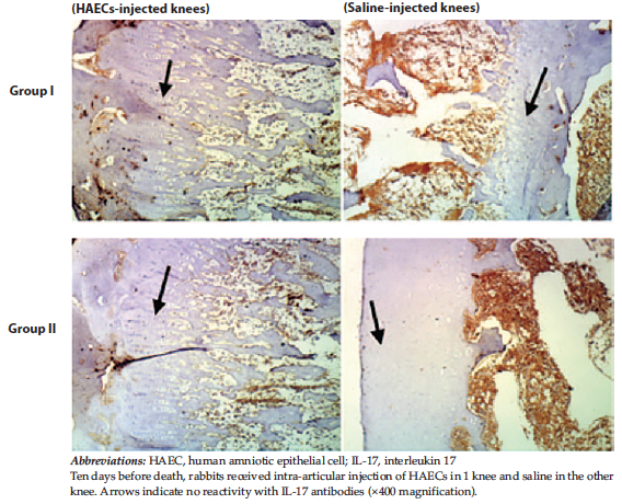 Materials and Methods: Our experimental design was based on subjecting groups of rabbits as a recipient model for human amniotic epithelial cell transplant into knee joints. Twenty rabbits received 200 µL sterile 0.9% sodium chloride solution containing 1 × 109 human amniotic epithelial cells/knee joint by intra-articular injection. Control groups received cell-free saline into knees, and some animals were not treated. After 10 days of xenotransplant, radiology scans and histologic sections of transplanted and nontransplanted knees were examined and compared. Immunohistochemistry staining was also applied to detect tumor necrosis factor-alpha and interleukin 17 (as inflammatory and immuno-rejection markers) in knee sections.