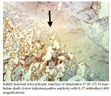 Figure 4. Photographs of Immunohistochemical Staining of Interleukin 17 into Knee Joint Sections of Treated Rabbits