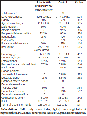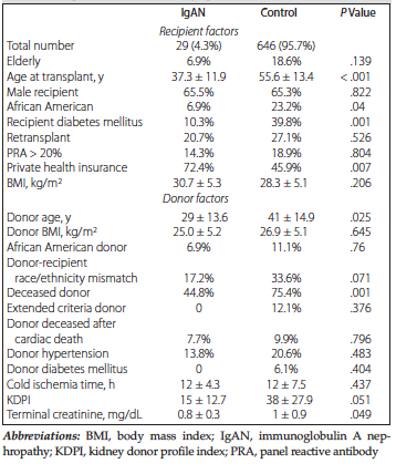Recipient and donor characteristics are shown in Table 1. Of the 675 total recipients, 29 (4.3%) received a transplant due to IgAN. These recipients were significantly younger at time of transplant (37.3 ± 11.9 vs 55.6 ± 13.4 y; P < .001) and more likely to have private health insurance (72.4% vs 45.9%; P = .007). The IgAN group was less likely to be African American (6.9% vs 23.2%; P = .001) or to have diabetes mellitus (10.3% vs 39.8%; P = .001).