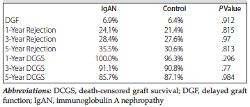 Materials and Methods: We performed a retrospective analysis of a database containing 29 patients with immunoglobulin A nephropathy and 646 other recipients who underwent transplant and were induced with alemtuzumab and steroid minimization treatment between March 2006 and May 2015. A matched cohort generated using propensity scoring was also analyzed.